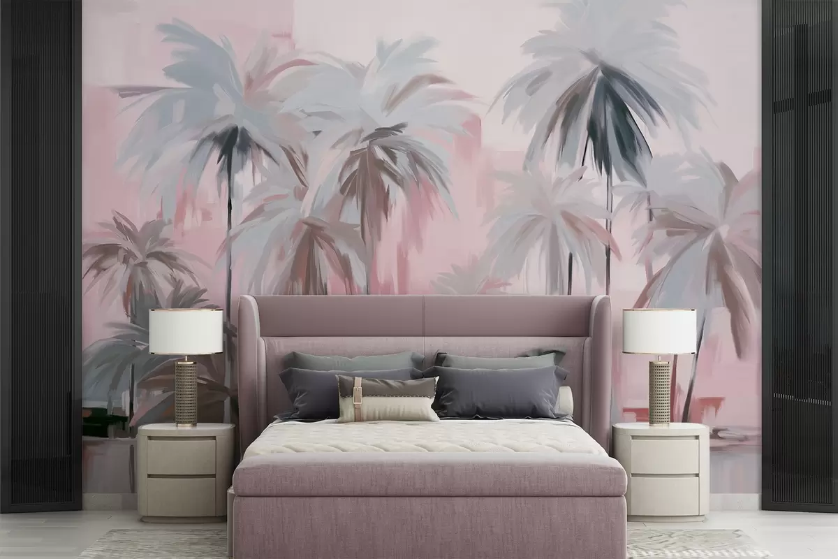 murales de pared Palmeras tropicales abstractas minimalistas en tonos pastel, sobre un fondo de tonos rosas y grises apagados w09212v1
