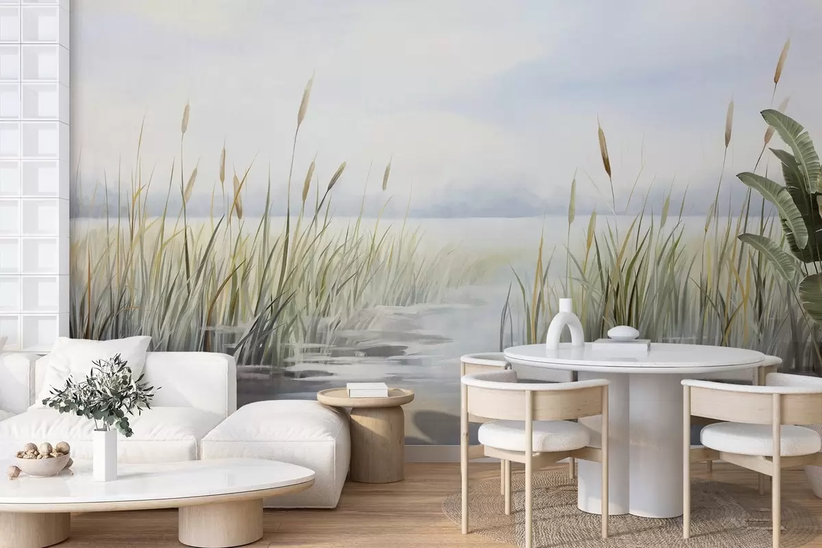 Fotomurales Una acuarela textura pintura imitación de paisaje con lago, hierba, cielo nublado y fondo borroso Nr. w09219