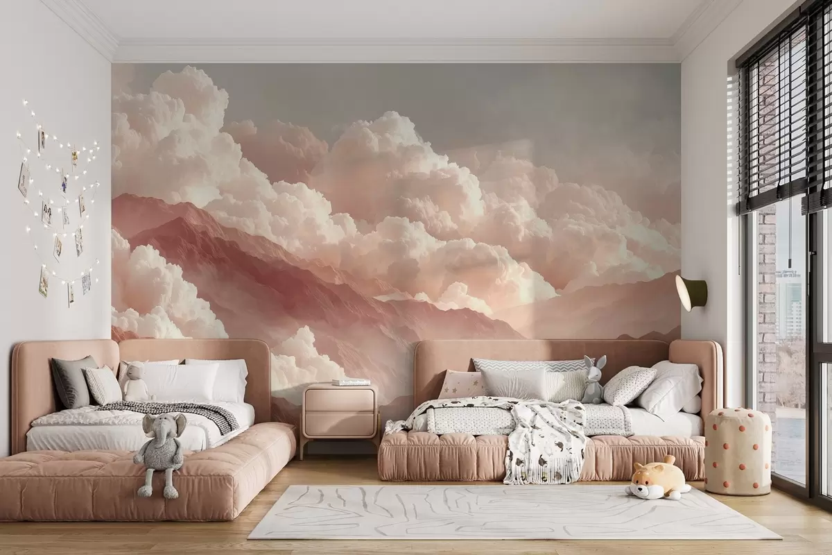 murales de pared Cálido amanecer sobre montañas con nubes esponjosas w09226
