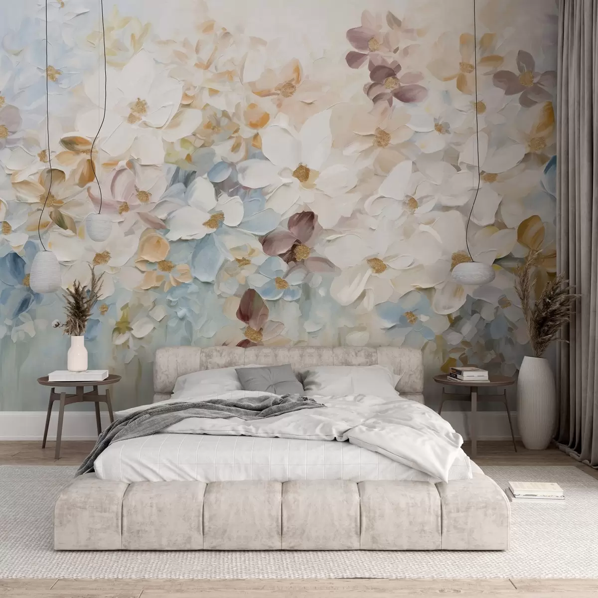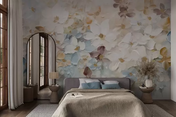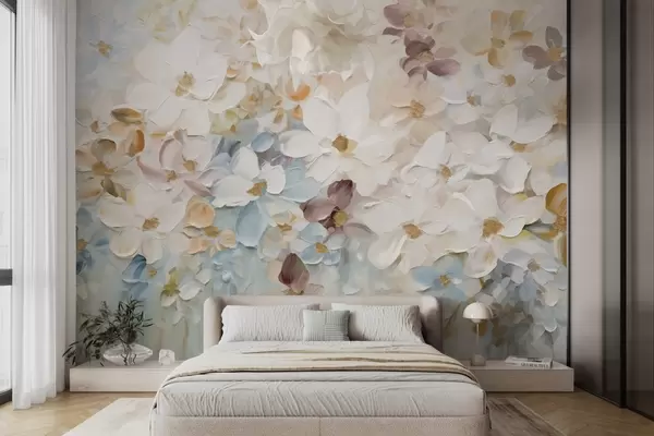 Fotomurales Pintura al óleo imitación de un jardín de flores con flores blancas, azules y naranjas, pinceladas suaves, colores pastel apagados Nr. w09236v1