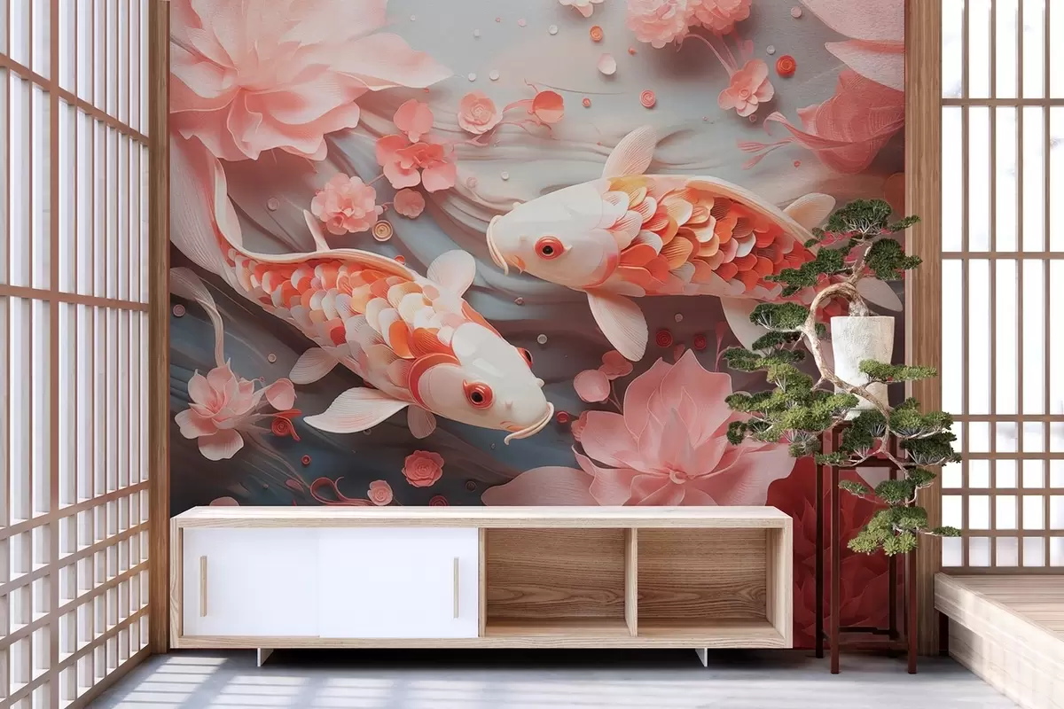 Fotomurales Delicados peces con escamas dimensionales nadan a través de un flujo de pétalos y suaves tonos rosados Nr. w09237