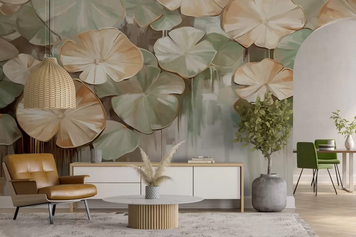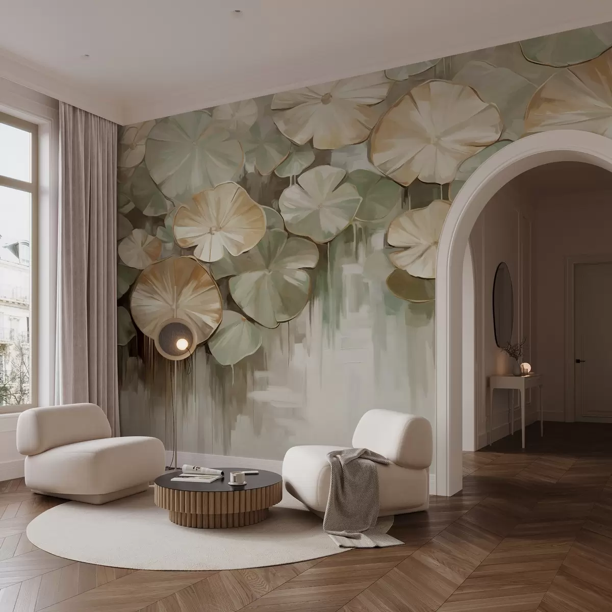 Fotomurales Nenúfares texturizados con colores verde y beige en un estanque, el fondo es una mezcla borrosa de blanco, verde y marrón Nr. w09255