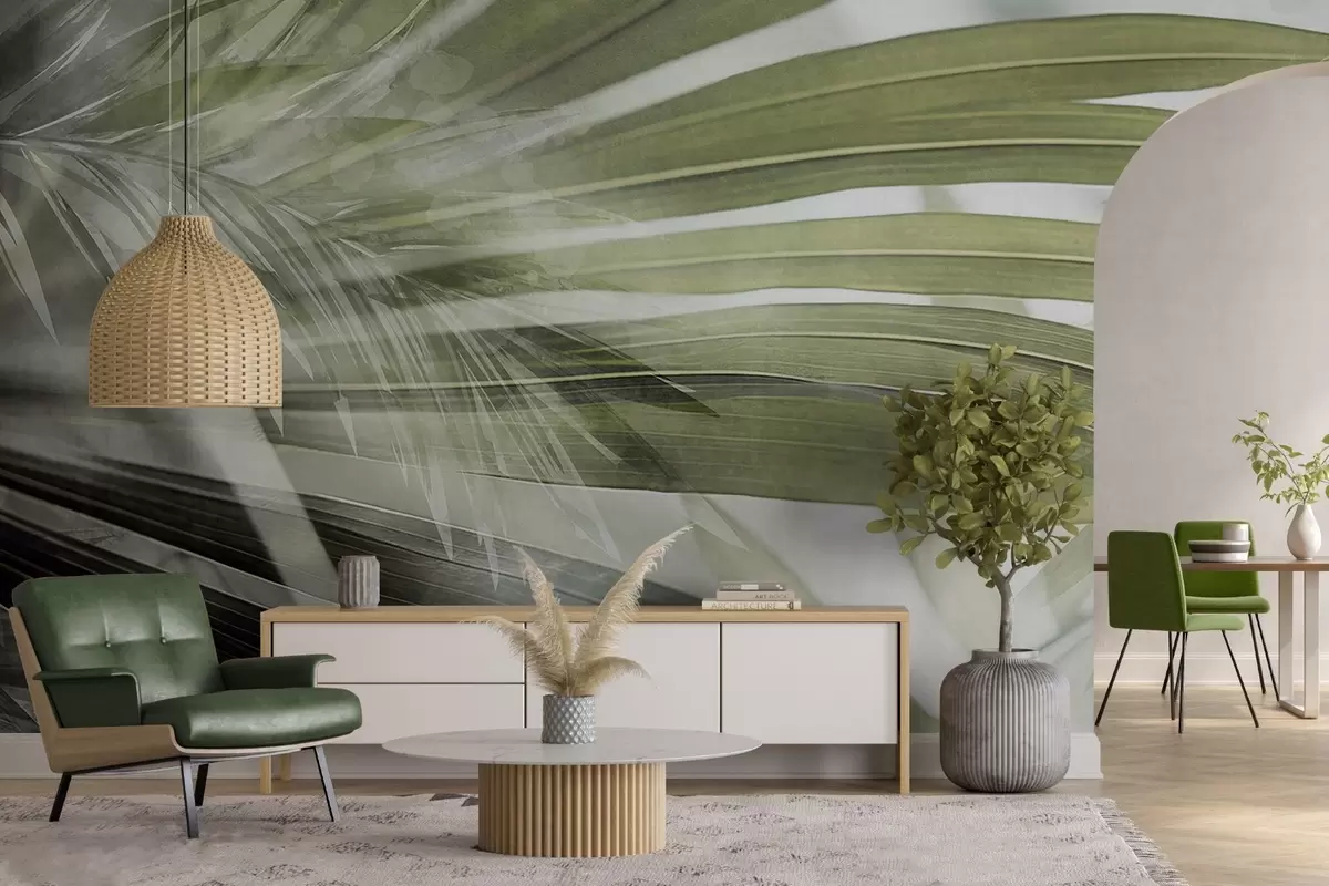 Fotomurales Hojas de palmera de un tono verde claro, superpuestas y creando un efecto de capas, sobre un fondo suave y neutro Nr. w09256v1