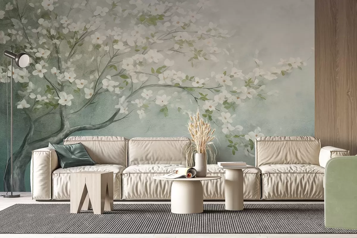 murales de pared Un árbol en flor con flores blancas en plena floración, sobre un fondo granulado de textura ruidosa de azules y verdes apagados w09261