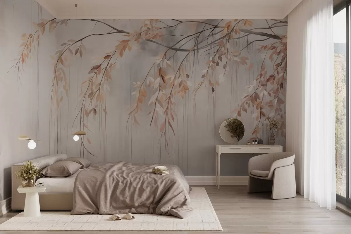 Fotomurales Una rama con hojas de color naranja claro colgando, fondo gris claro con textura borrosa, estilo suave y delicado Nr. w09265