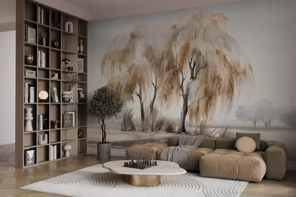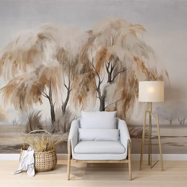 Fotomurales Sauces texturizados con hojas marrones y blancas en la orilla de un lago, con algo de hierba a su alrededor, en un día brumoso Nr. w09268
