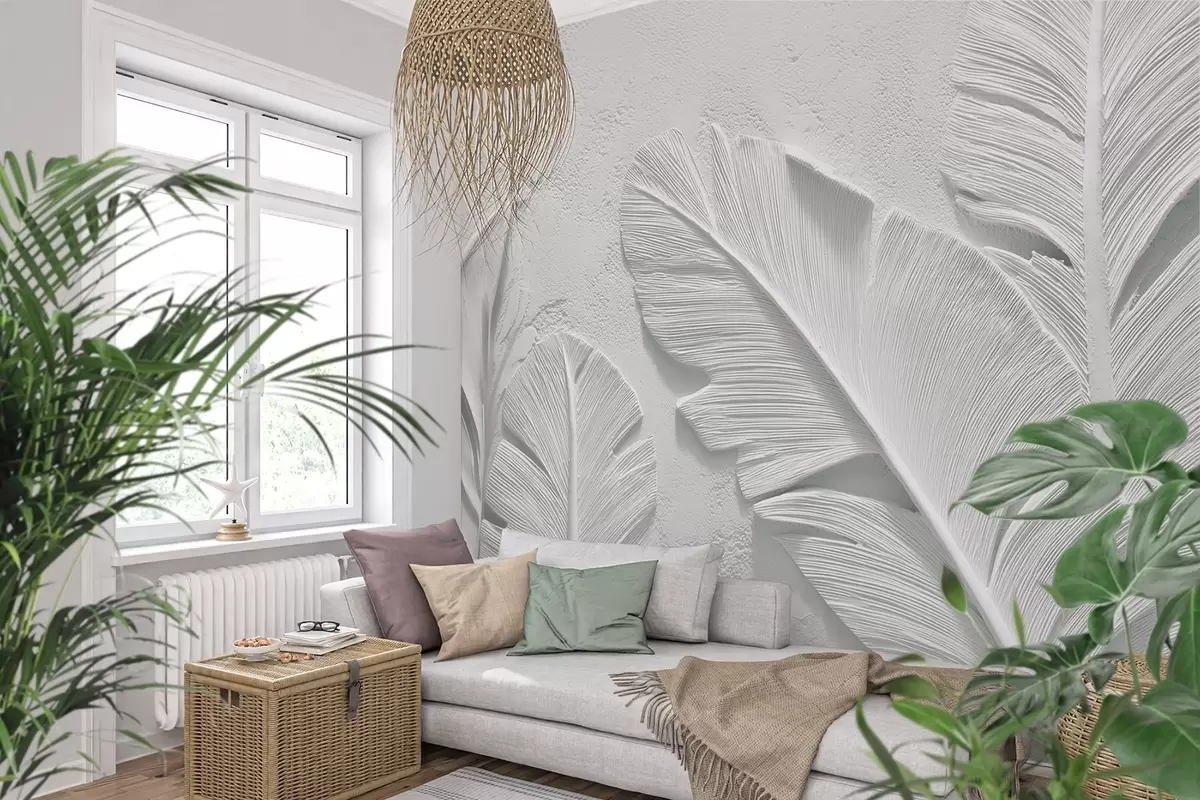 Fotomurales Hojas grises texturizadas sobre un fondo con relieve de yeso falso Nr. w09307