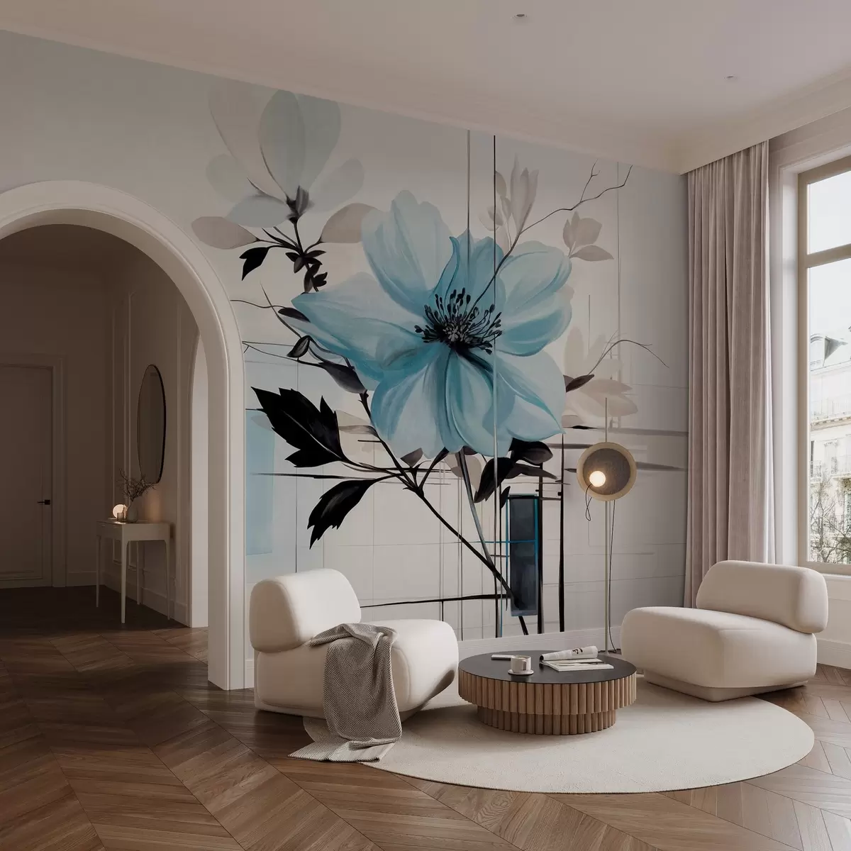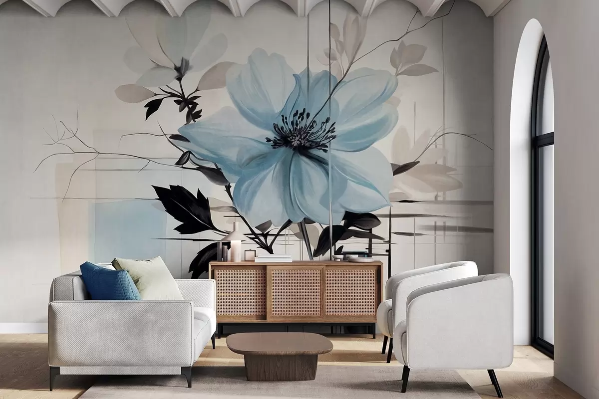 Fotomurales Flor abstracta azul texturizada con hojas y ramas oscuras, formas geométricas minimalistas y líneas en colores apagados Nr. w09332