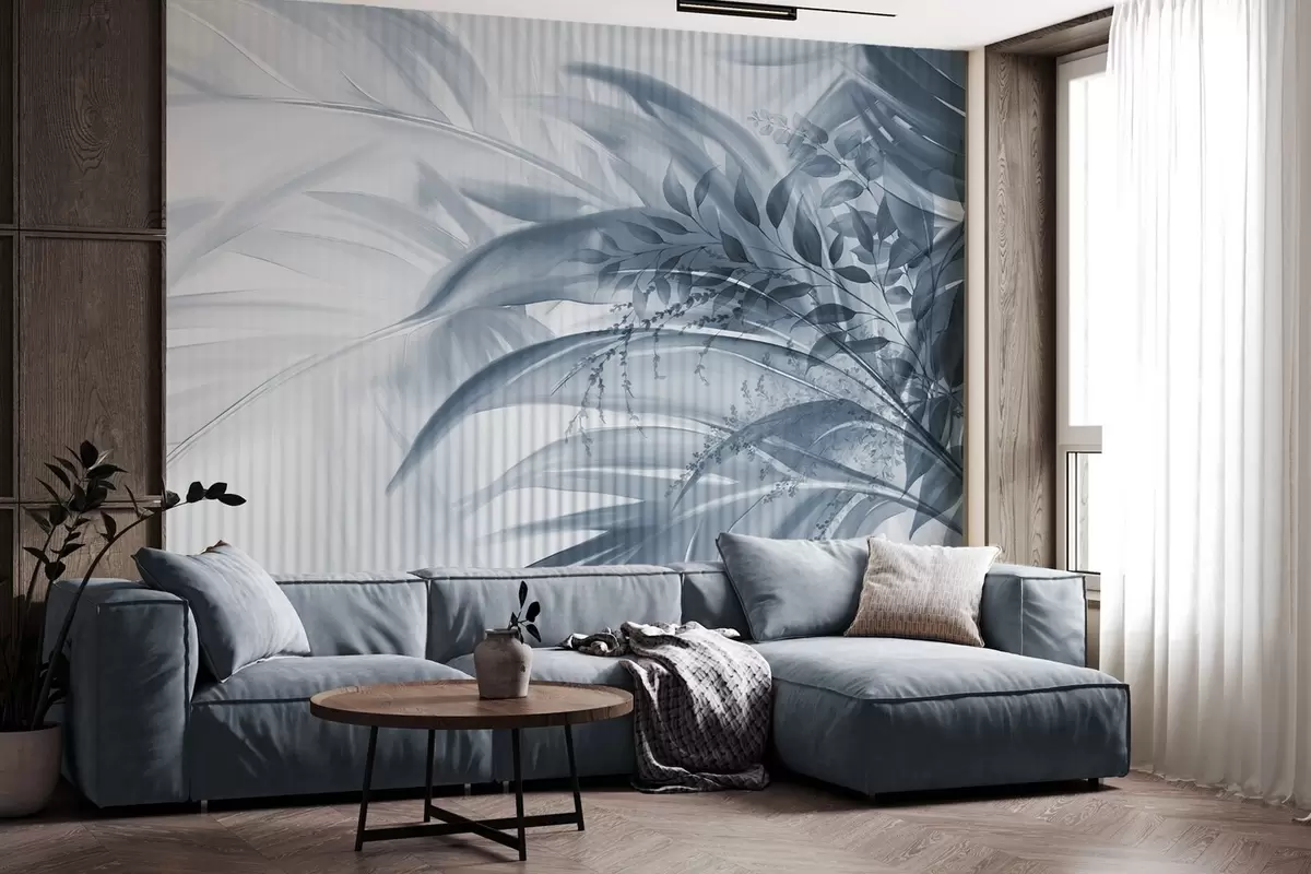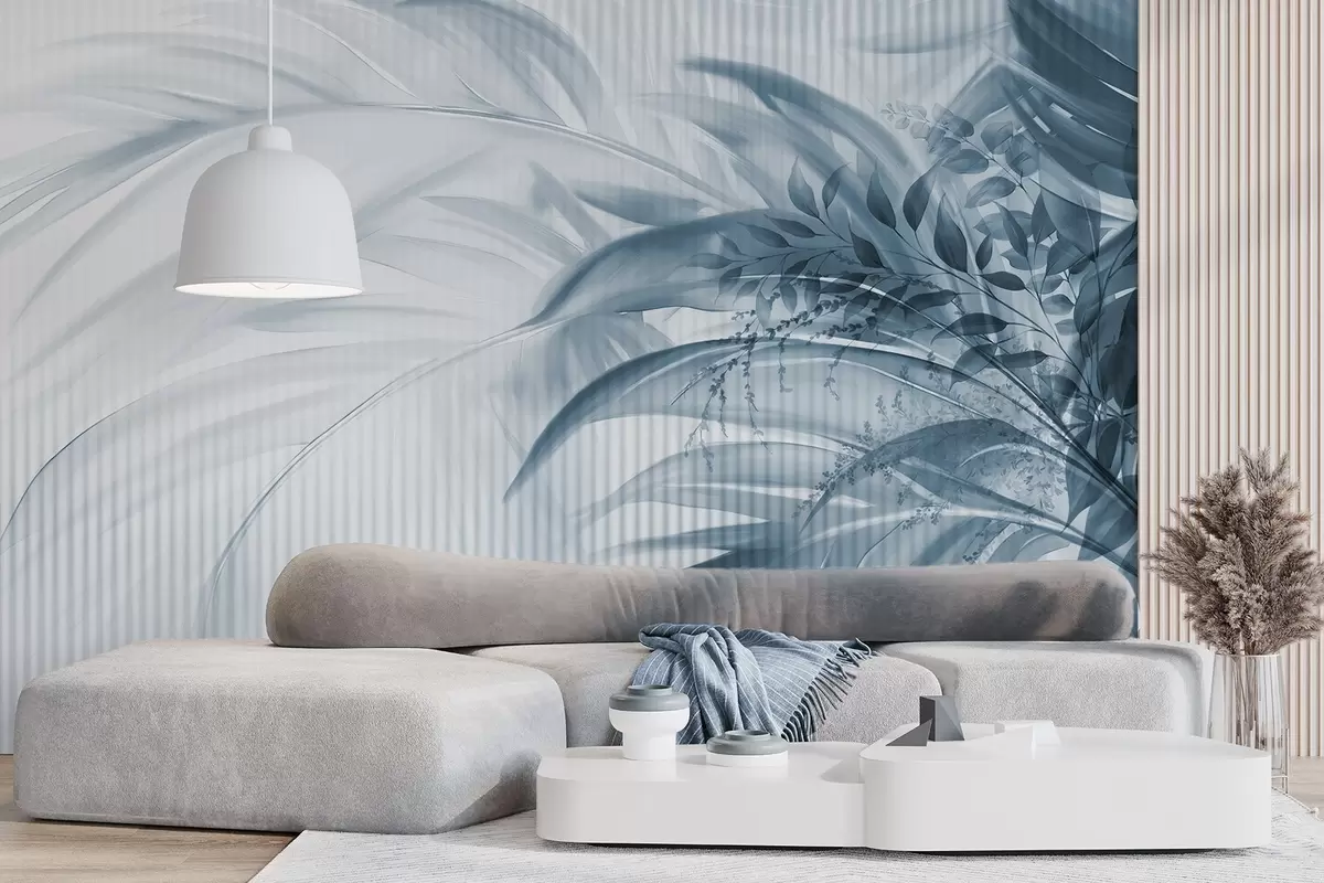 Fotomurales Palmera tropical de hojas azules con fondo blanco a rayas, iluminación suave, pinceladas delicadas, formas orgánicas Nr. w09343v1