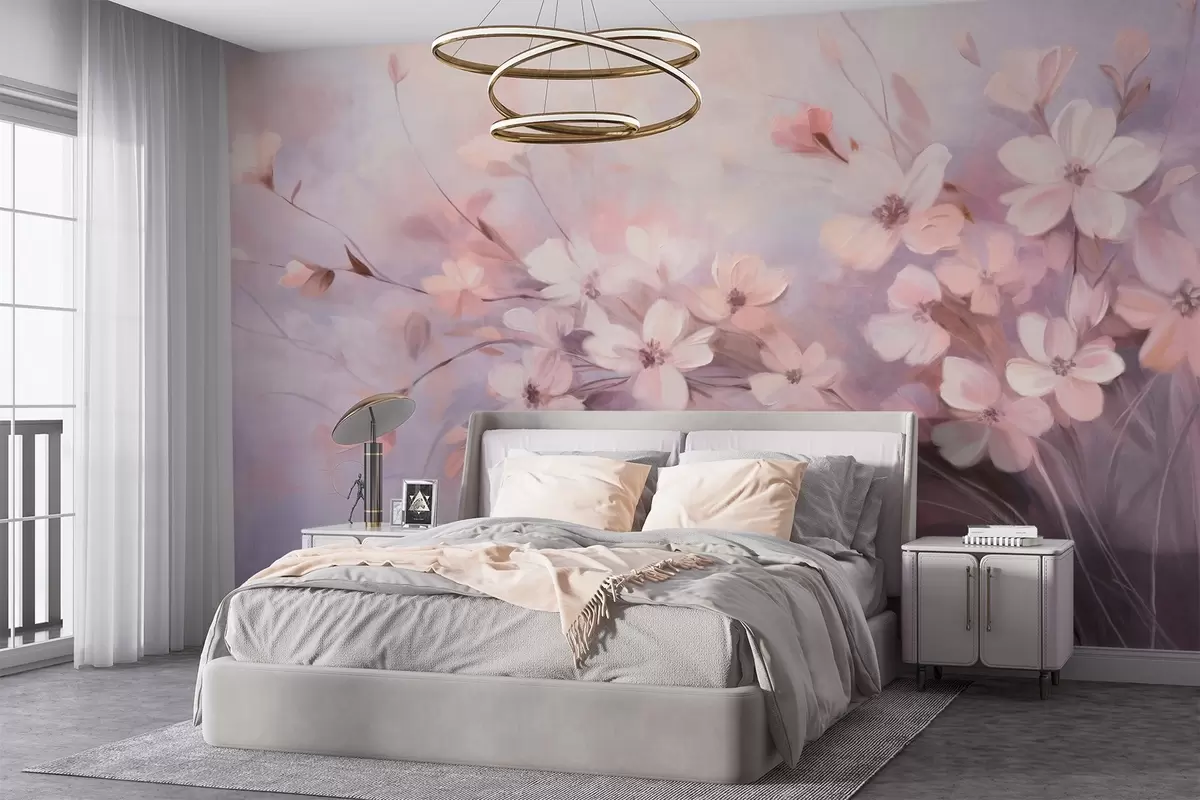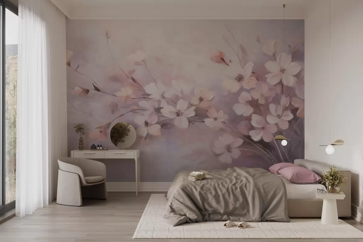 Fotomurales Un arreglo floral con delicadas flores de bordes suaves y difuminados, sobre un fondo pastel de tonos lavanda y rosa claro Nr. w09369
