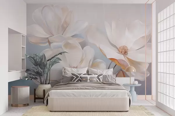 Fotomurales Flores blancas de magnolia fantásticas con pétalos de textura delicada, sobre un fondo suave y abstracto. Nr. w09373