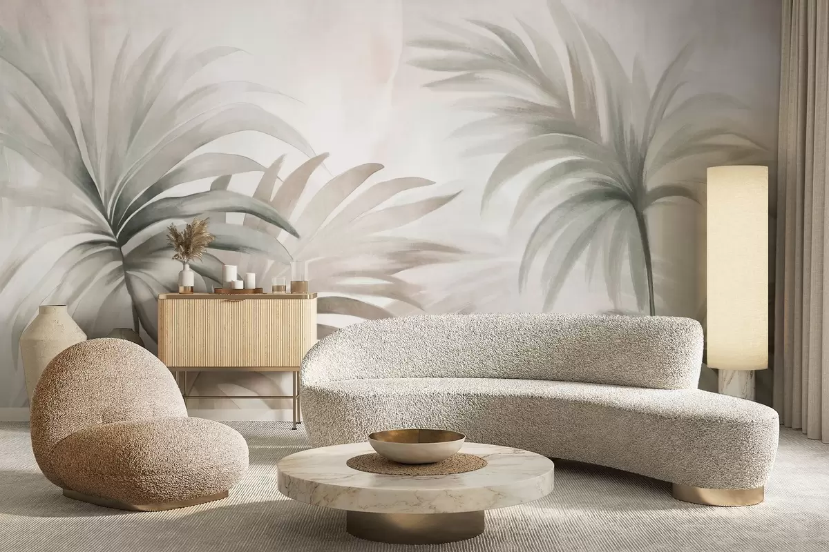 Fotomurales Hojas de palmera texturizadas en colores neutros, fondo abstracto beige, pinceladas suaves, follaje tropical texturizado Nr. w09380