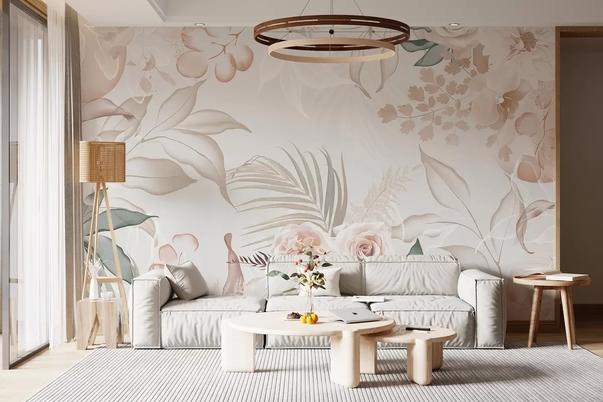 Fotomurales Arreglo floral con textura, compuesto por rosas, orquídeas, eucalipto y hojas de palmera en colores pastel, con fondo beige Nr. w09393