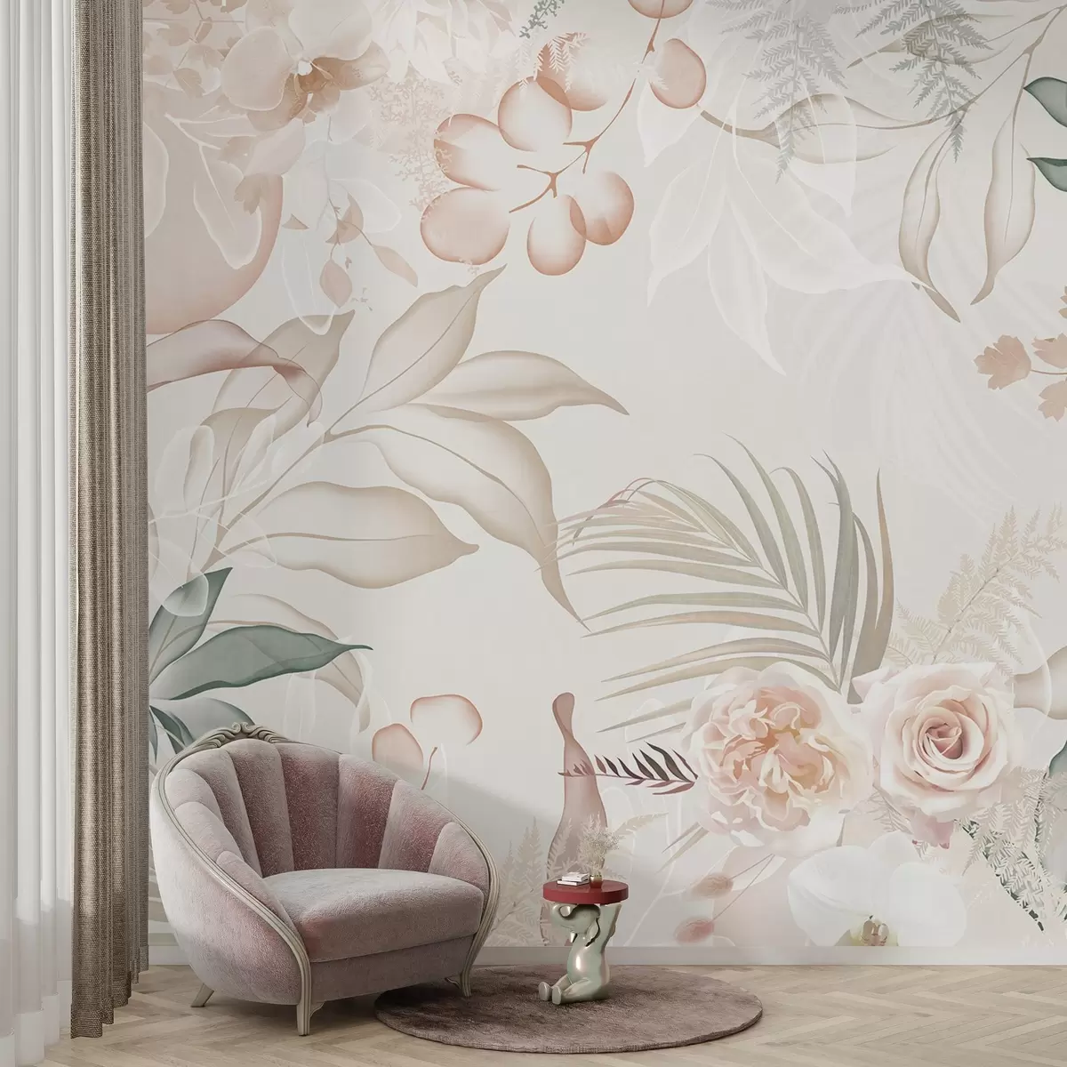 Fotomurales Arreglo floral con textura, compuesto por rosas, orquídeas, eucalipto y hojas de palmera en colores pastel, con fondo beige Nr. w09393