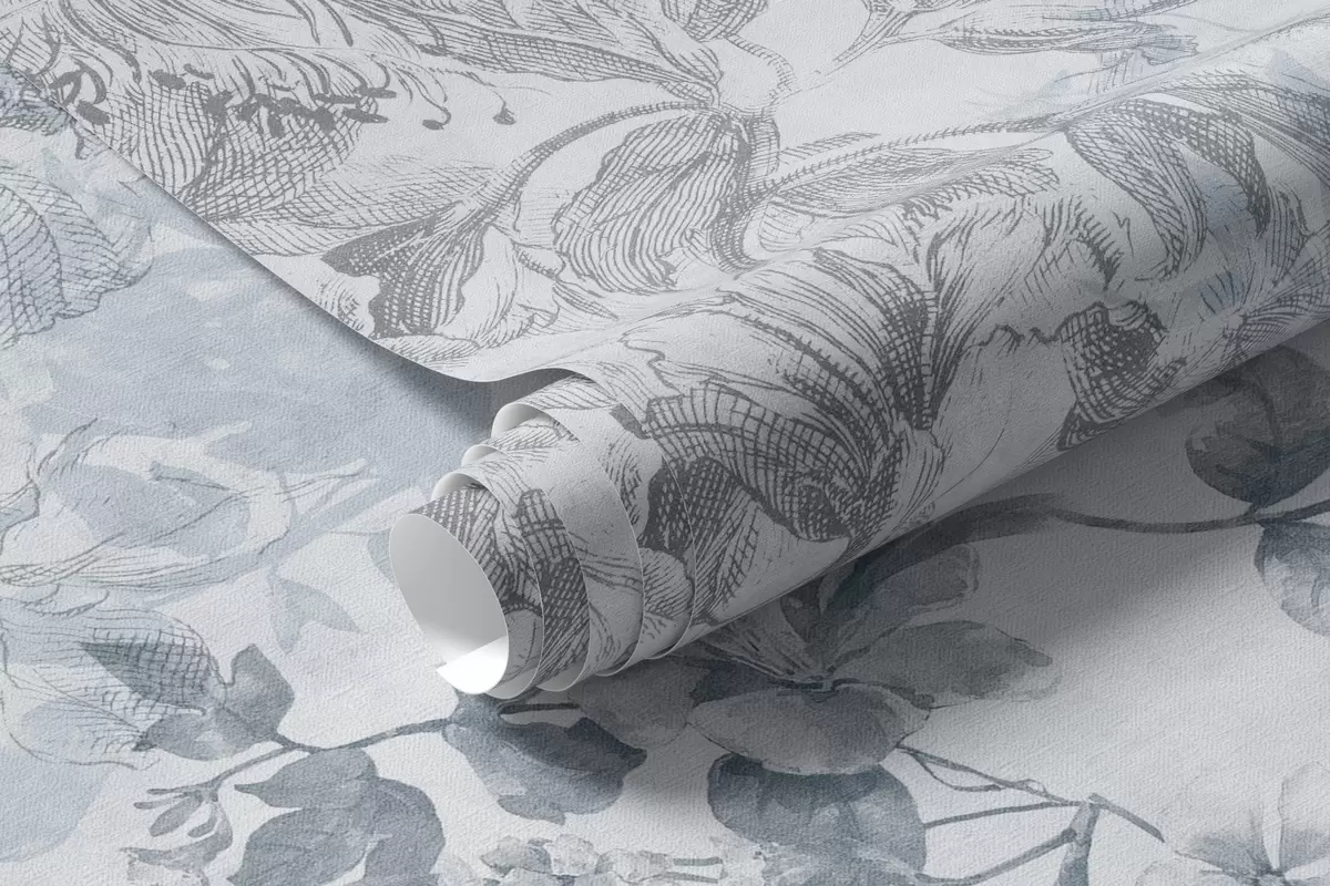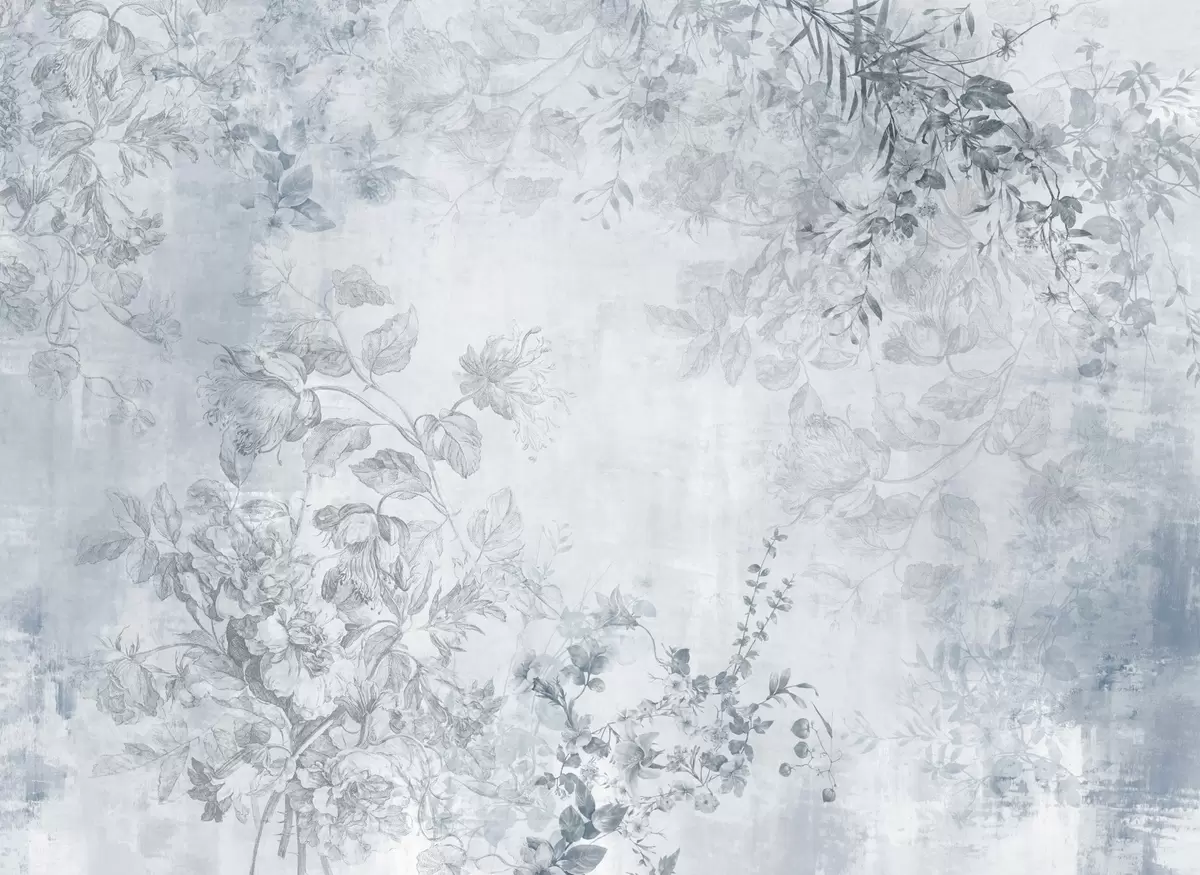 Fotomurales Arte floral vintage con textura, ilustraciones de delicadas flores y hojas de jardín en estilo dibujo, tonos azules suaves Nr. w09402v1