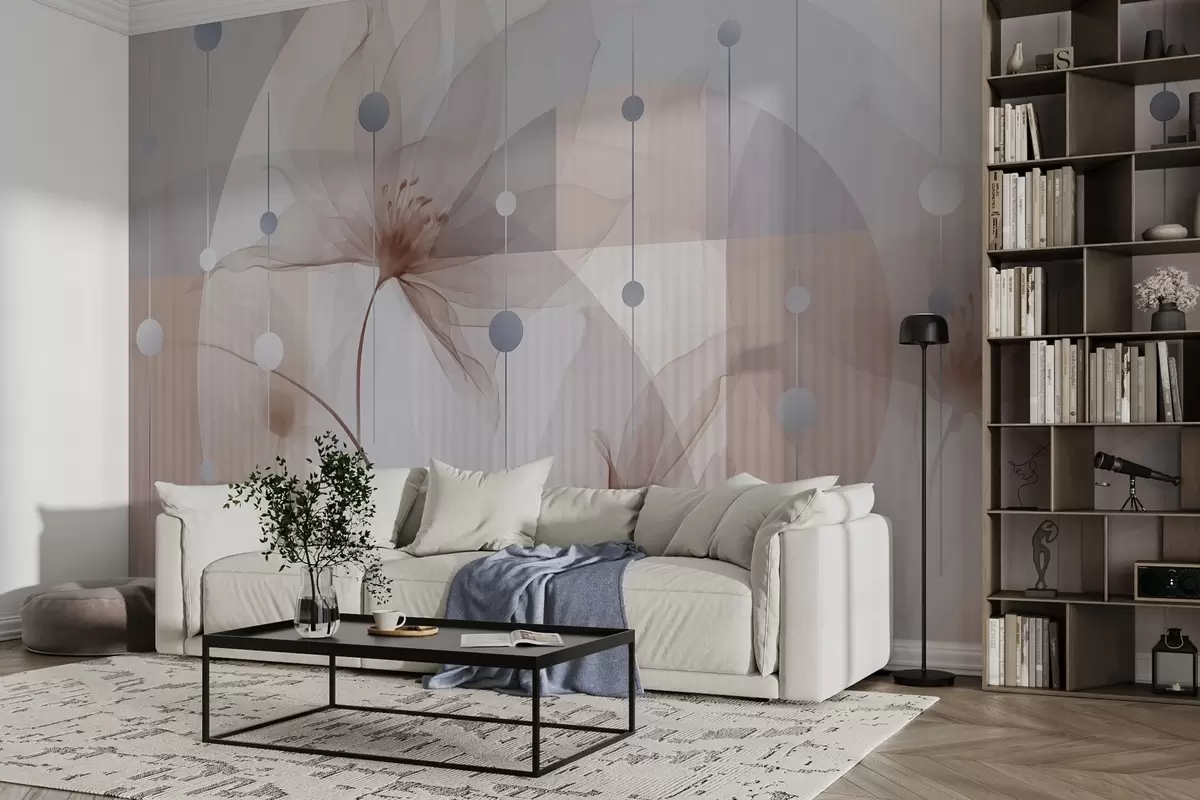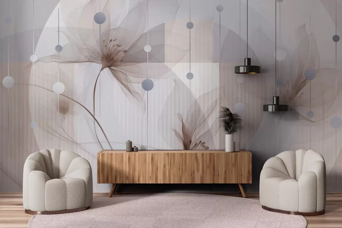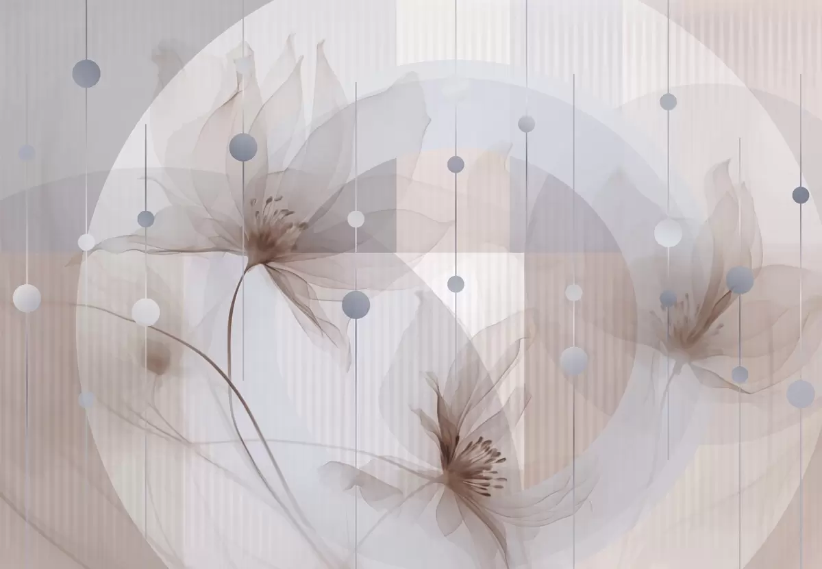 Fotomurales Flores abstractas translúcidas, círculos y formas geométricas, paleta de colores azul pastel, marrón y blanco Nr. w09419v1
