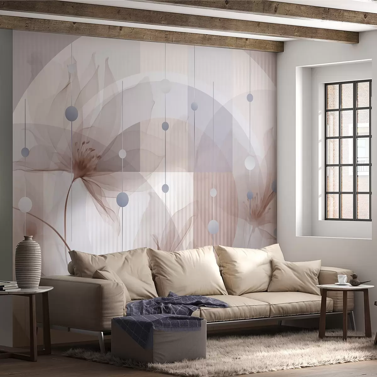 Fotomurales Flores abstractas translúcidas, círculos y formas geométricas, paleta de colores azul pastel, marrón y blanco Nr. w09419v1