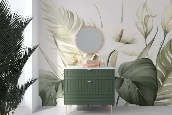 Fotomurales Calas blancas y hojas tropicales verdes, ilustración botánica, fondo claro, estilo vintage, texturizado Nr. w09423