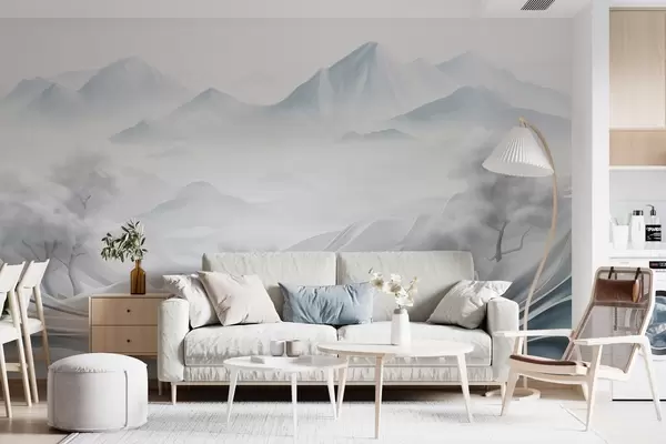 murales de pared Paisaje montañoso abstracto nevado con árboles blancos y niebla, estilo minimalista con textura w09426