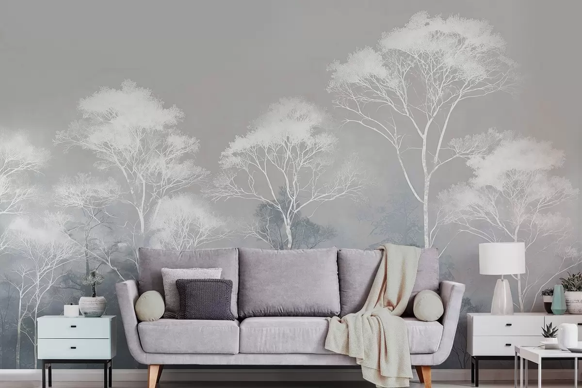 Fotomurales Árboles minimalistas en tonos azul grisáceos, en la niebla Nr. w09448