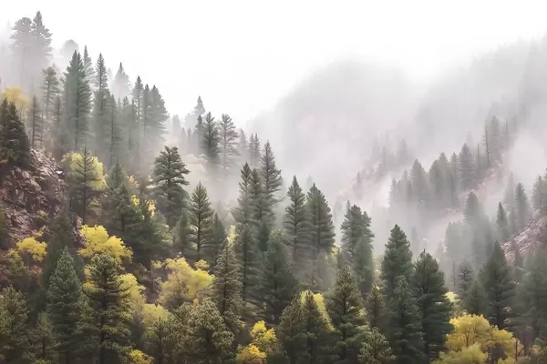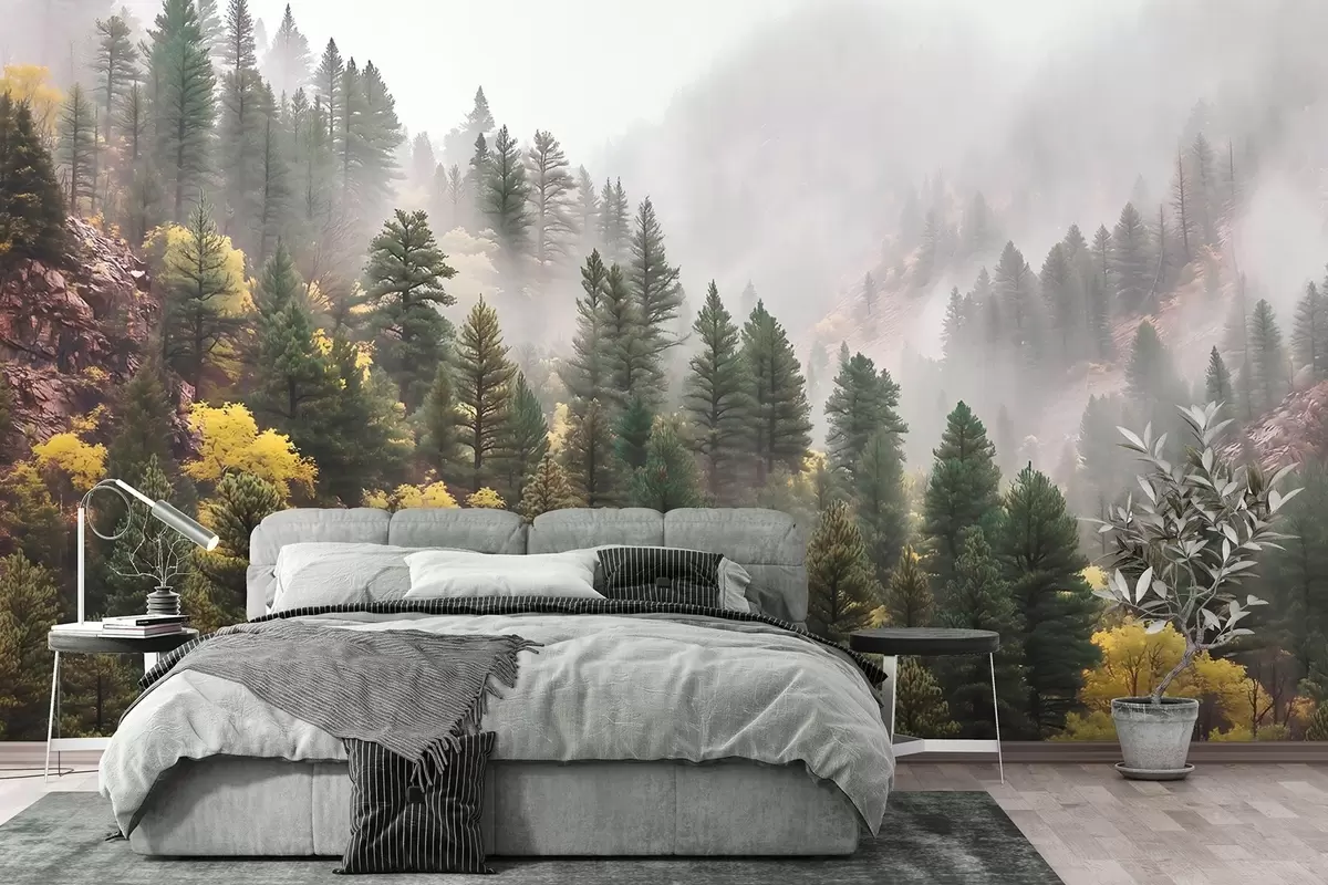 Fotomurales Bosque de pinos brumoso y evocador en las montañas Nr. w09463