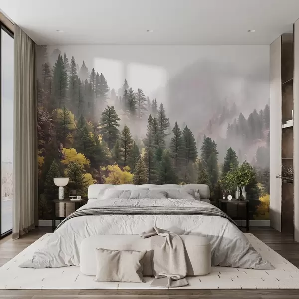 Fotomurales Bosque de pinos brumoso y evocador en las montañas Nr. w09463