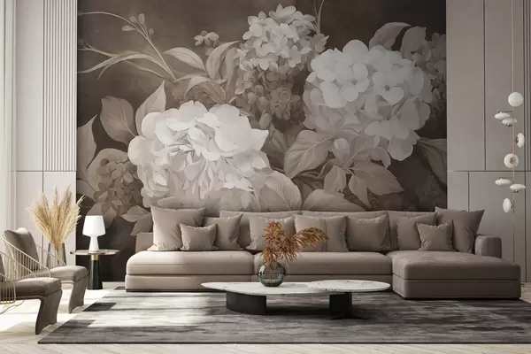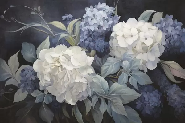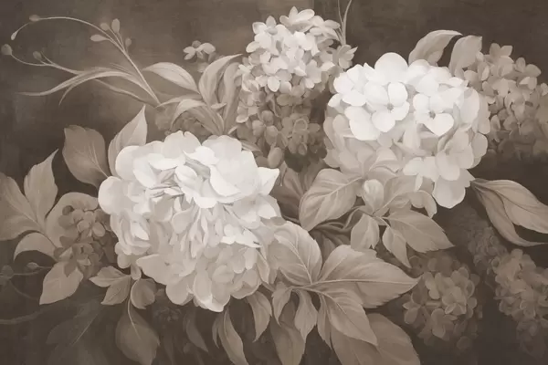 Fotomurales Pintura texturizada en sepia imitando flores de hortensias con hojas grandes, fondo abstracto y oscuro Nr. w09465