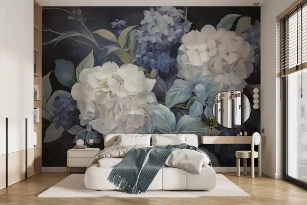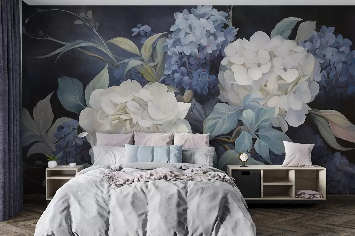 Fotomurales Pintura texturizada en azul oscuro imitando flores de hortensias con hojas grandes, fondo abstracto y oscuro Nr. w09465v1