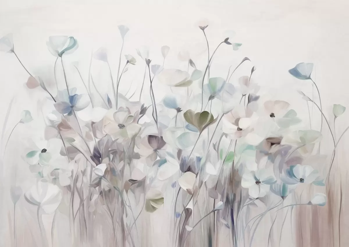 Fotomurales Campo abstracto de flores azules y marrones con tallos largos y hojas, texturizado, colores pastel y apagados Nr. w09466v1