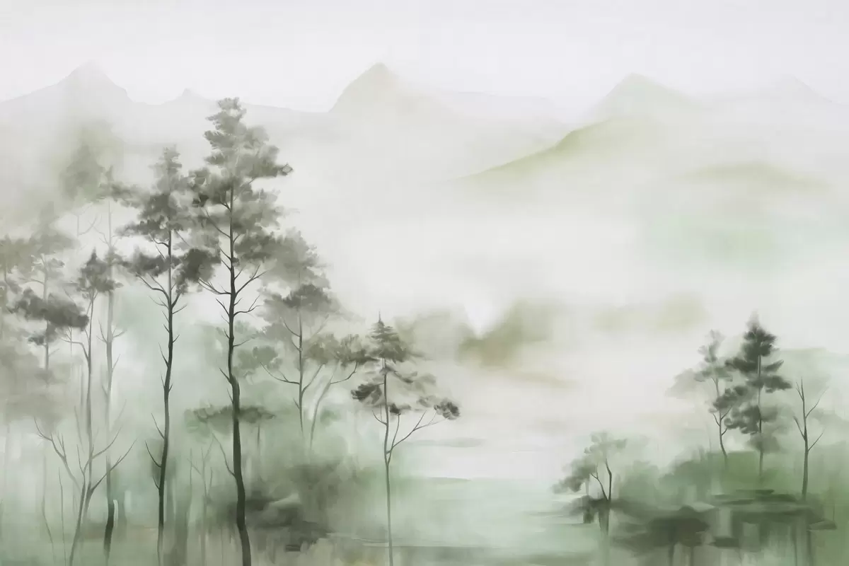 Fotomurales Paisaje brumoso con árboles altos y montañas en tonos verdes y grises apagados, estilo minimalista, texturizado Nr. w09469
