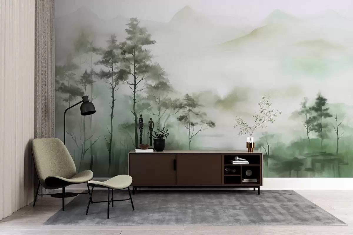 Fotomurales Paisaje brumoso con árboles altos y montañas en tonos verdes y grises apagados, estilo minimalista, texturizado Nr. w09469