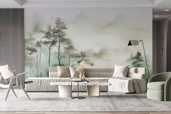 Fotomurales Paisaje brumoso con árboles altos y montañas en tonos verdes y grises apagados, estilo minimalista, texturizado Nr. w09469