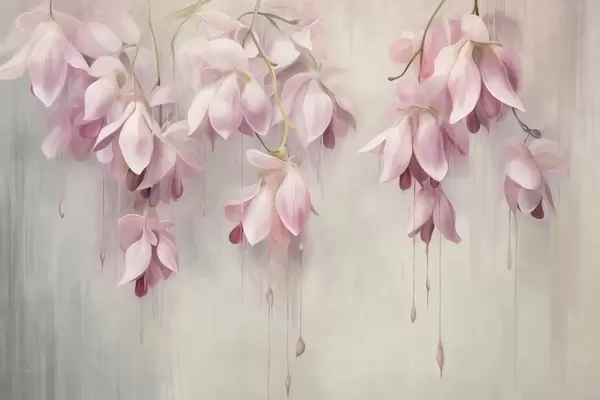 Fotomurales Flores rosas colgantes, fondo gris claro, arreglo floral con textura, arte botánico, colores pastel Nr. w09471