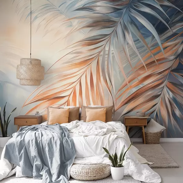 murales de pared Hojas de palmera con tonos naranjas y azules, fondo con textura ligera y colores suaves, elegante estilo tropical w09475