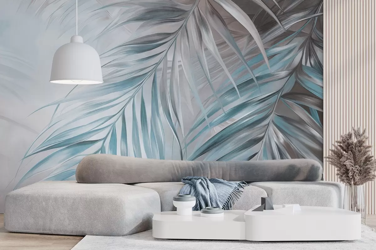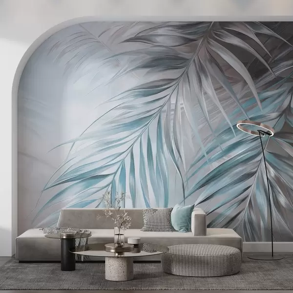 Fotomurales Hojas de palmera con tonos grises y azules, fondo con textura ligera y colores suaves, elegante estilo tropical Nr. w09475v1