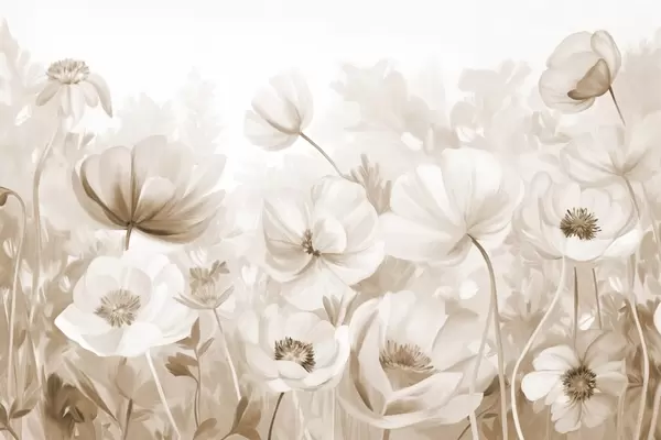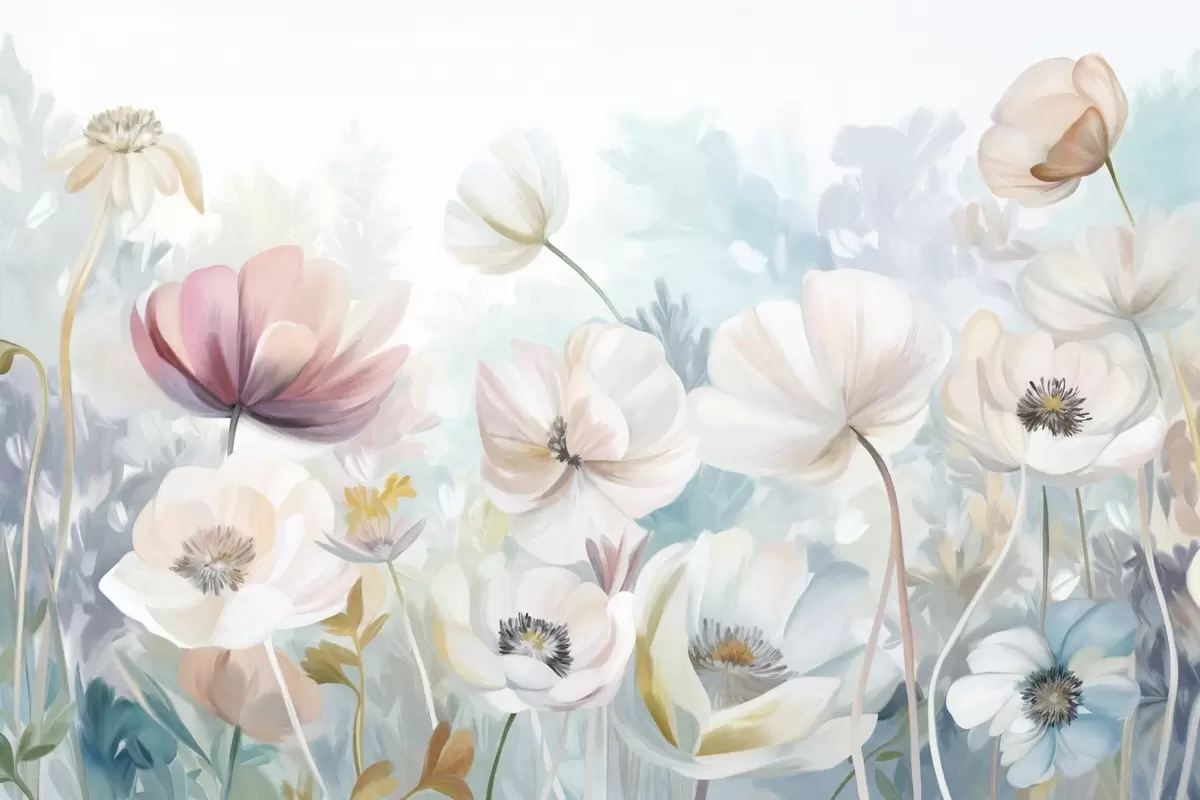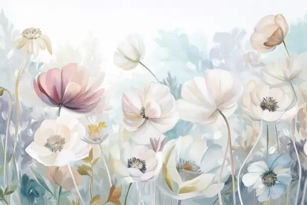 Fotomurales Un campo de flores en tonos pastel con delicados pétalos y suaves hojas verdes, en un estilo acuarela onírico y texturizado Nr. w09481