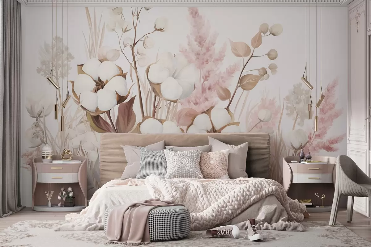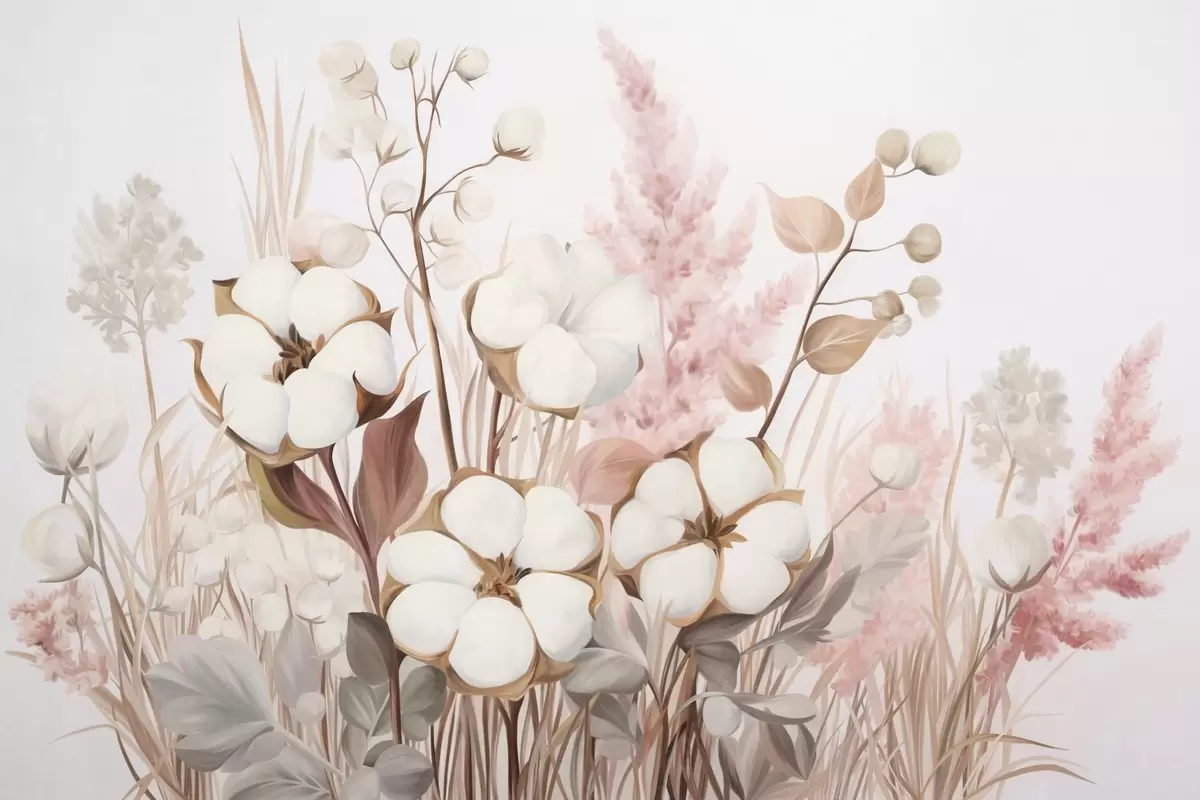 Fotomurales Flores con textura de algodón con hierba de la pampa blanca y rosa, hojas y hierbas beige y marrones, fondo blanco. Nr. w09489