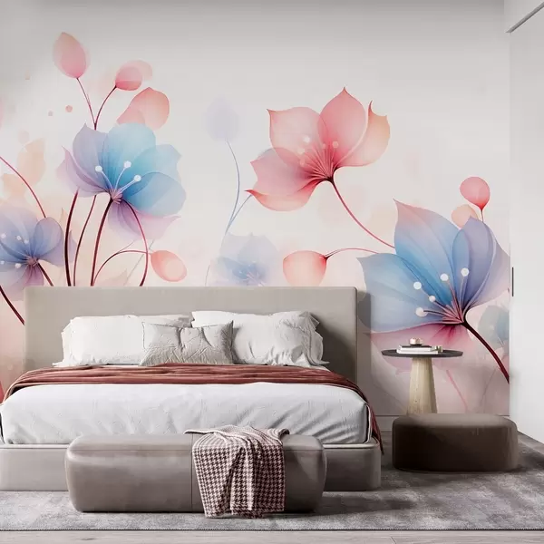 Fotomurales Delicadas flores rosa y azul: flora etérea sobre un fondo blanco acuarelado Nr. w09507
