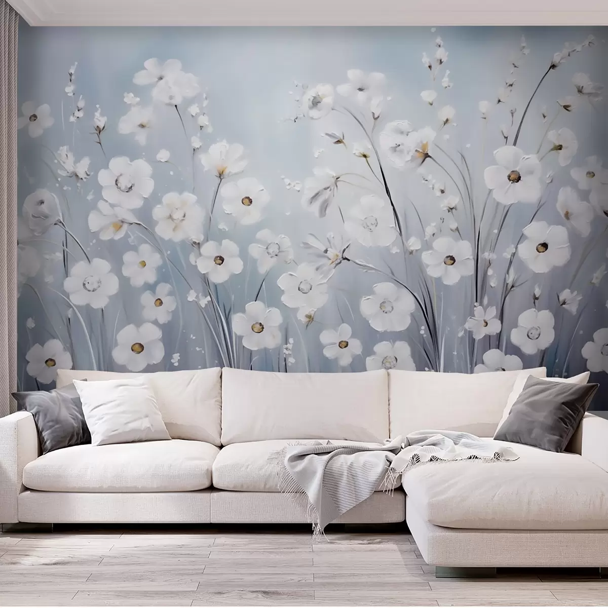 murales de pared Flores blancas contra un cielo azul en estilo pintura al óleo w09516