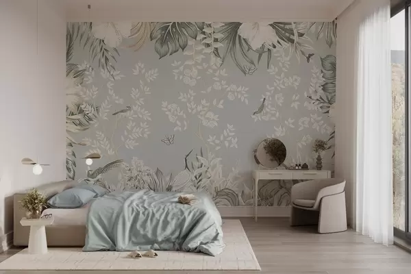 Fotomurales Arte tropical en tonos pastel con textura, con pájaros, mariposas, flores de hibisco, hojas de palmera y árboles sobre un fondo azul claro. Nr. w09528