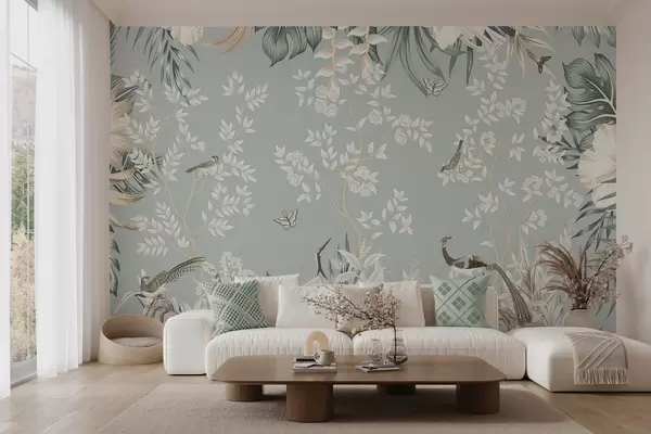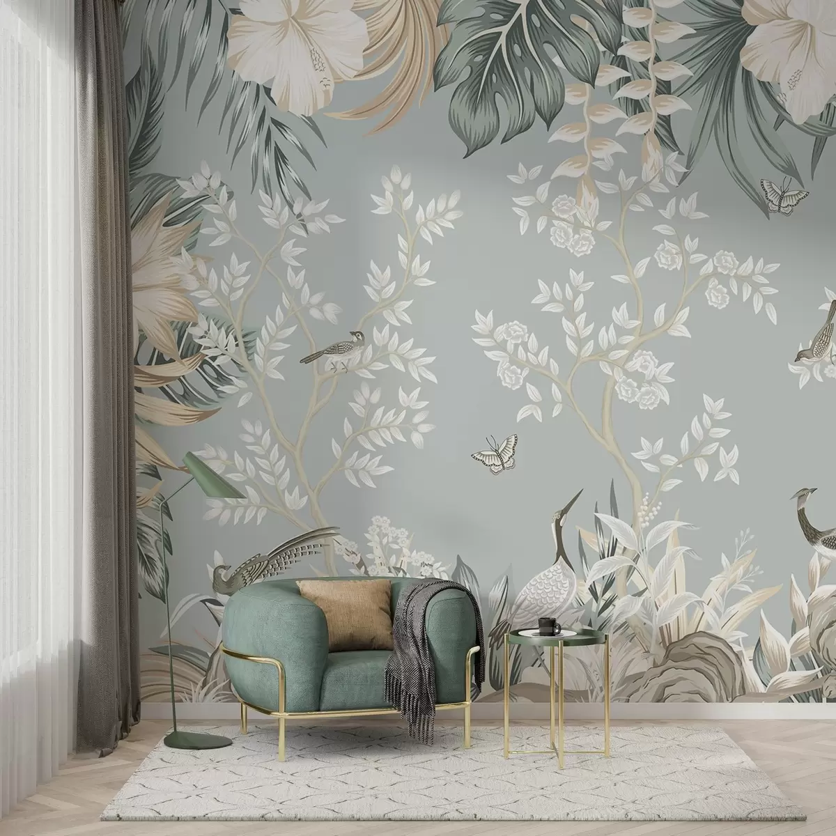 murales de pared Arte tropical en tonos pastel con textura, con pájaros, mariposas, flores de hibisco, hojas de palmera y árboles sobre un fondo azul claro. w09528