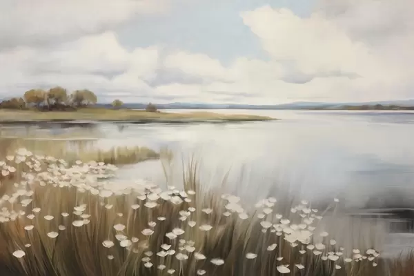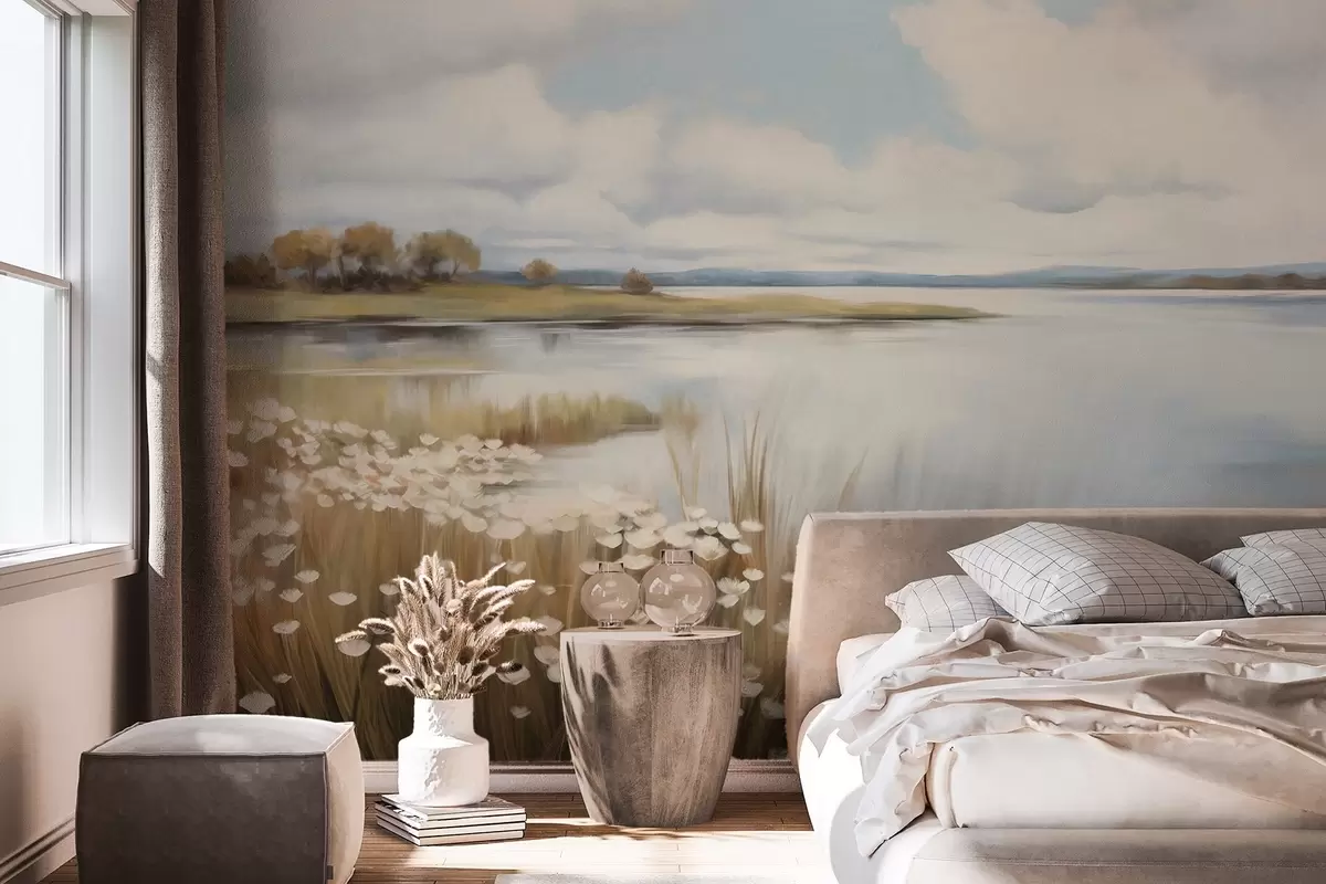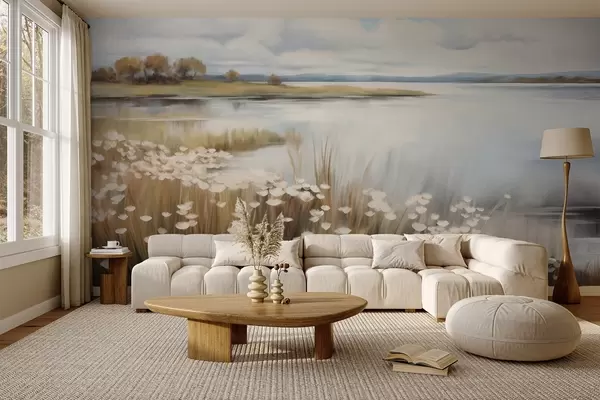 Fotomurales Paisaje con textura, campo de flores blancas y hierba alta, un lago al fondo, una colina cubierta de hierba con árboles, colores suaves. Nr. w09530