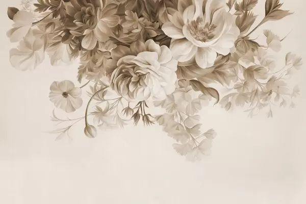 Fotomurales Arreglo floral vintage con rosas, peonías y otras flores con textura y follaje, sobre un fondo claro. Nr. w09532