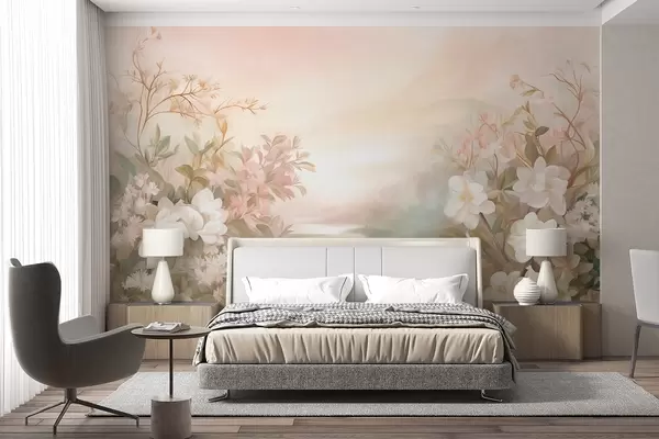 Fotomurales Un paisaje con un río rodeado de flores y plantas, colores suaves, cielo rosado, estilo con textura de acuarela Nr. w09537