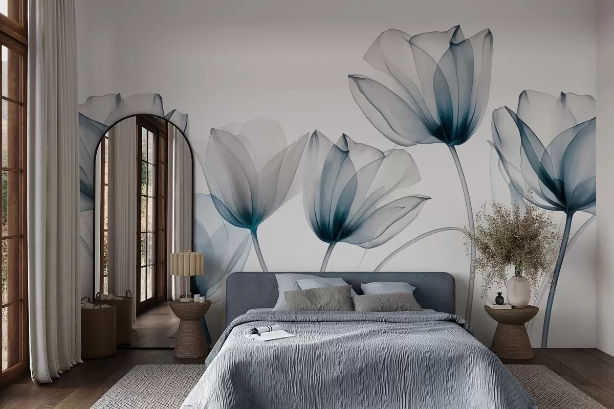 Fotomurales Flores de tulipán translúcidas de color azul y blanco con tallos largos, sobre un fondo claro, delicadas y con textura, arte floral. Nr. w09538