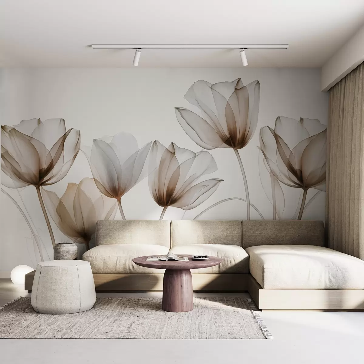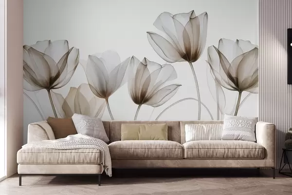 Fotomurales Flores de tulipán translúcidas de color marrón y blanco con tallos largos, sobre un fondo claro, delicadas y con textura, arte floral Nr. w09538v1
