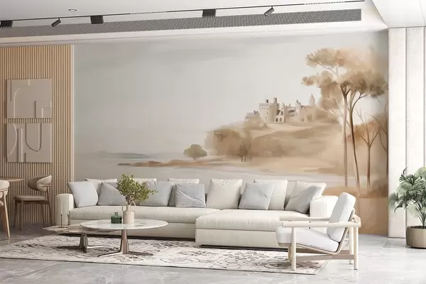 Fotomurales Paisaje con un castillo en una colina cerca del mar, una playa de arena en primer plano, colores apagados, arte texturizado Nr. w09540
