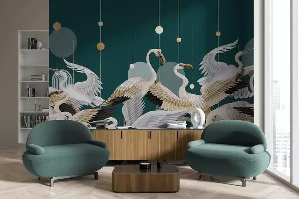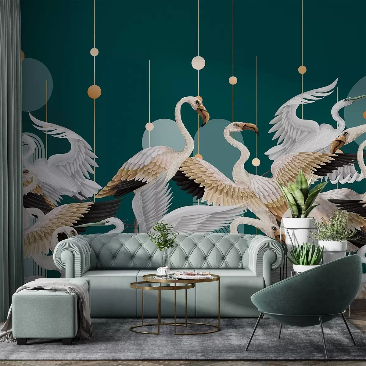 Fotomurales Una bandada de flamencos blancos con delicadas alas, sobre un fondo verde azulado oscuro con líneas y círculos amarillos. Nr. w09546