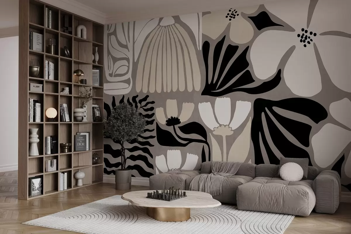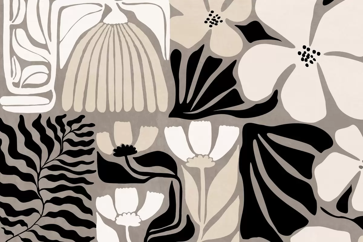 Fotomurales Flores y hojas estilizadas de estilo minimalista moderno en beige, negro y blanco, con textura sobre fondo gris. Nr. w09547