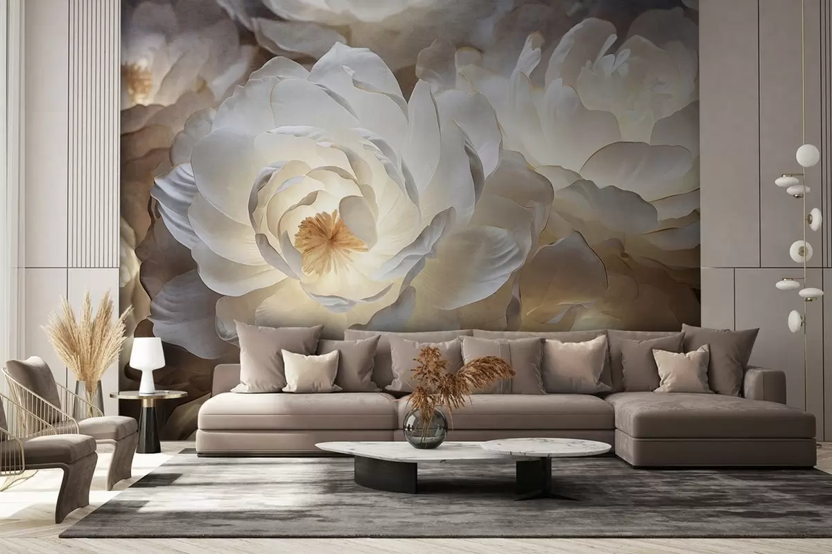 Fotomurales Grandes flores de peonía blancas con centros amarillos, iluminación suave y pétalos delicados con textura en capas. Nr. w09550
